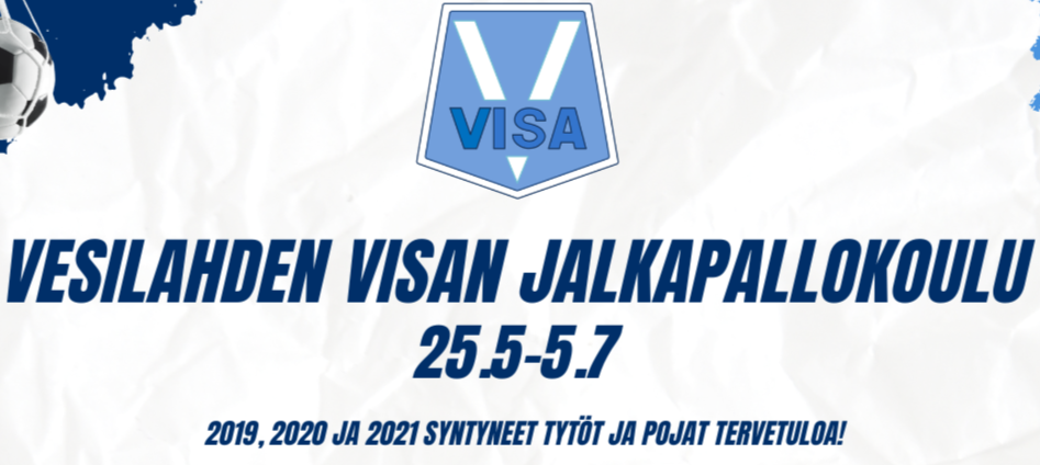 Vesilahden Visan jalkapallojaos järjestää jalkapallokoulun kolmelle ikäryhmälle 24.5-5.7 välisenä aikana. Pallokoulu starttaa siis 24.5 sunnuntaina klo 15.00 ja kertoja on seitsemän.