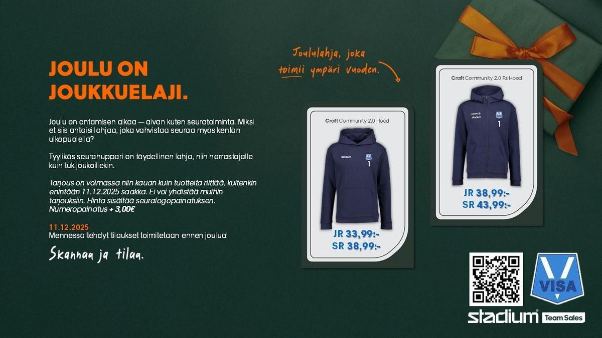 Visalla on nyt käynnissä joulun hupparikampis, joka kannattaa hyödyntää! Tyylikäs seurahuppari on täydellinen lahja niin pelaajille, valmentajille kuin tukijoukoillekin.